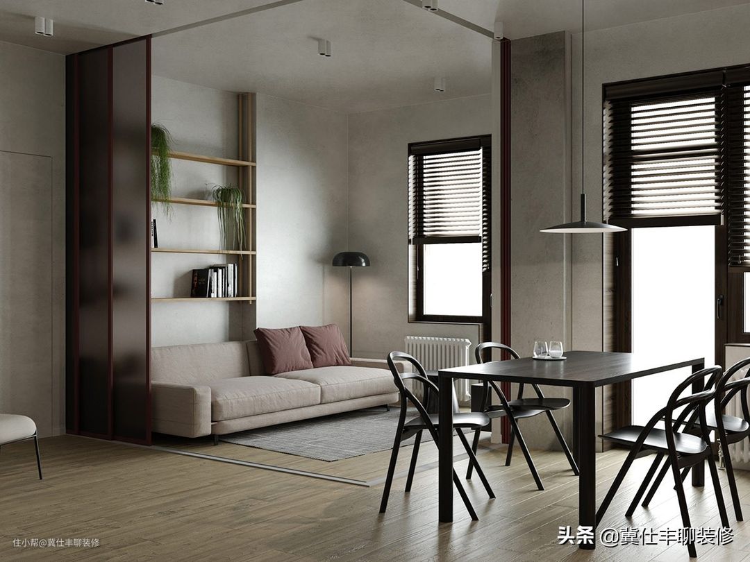 ▲ 客厅出乎预料地安装了推拉门,尤其让人感受到惊艳的是,玻璃门选择了深紫色的玻璃框和灰色的玻璃,用材和配色可谓别出心裁。此外,玻璃门的安装,为客厅的多功能提供了条件。