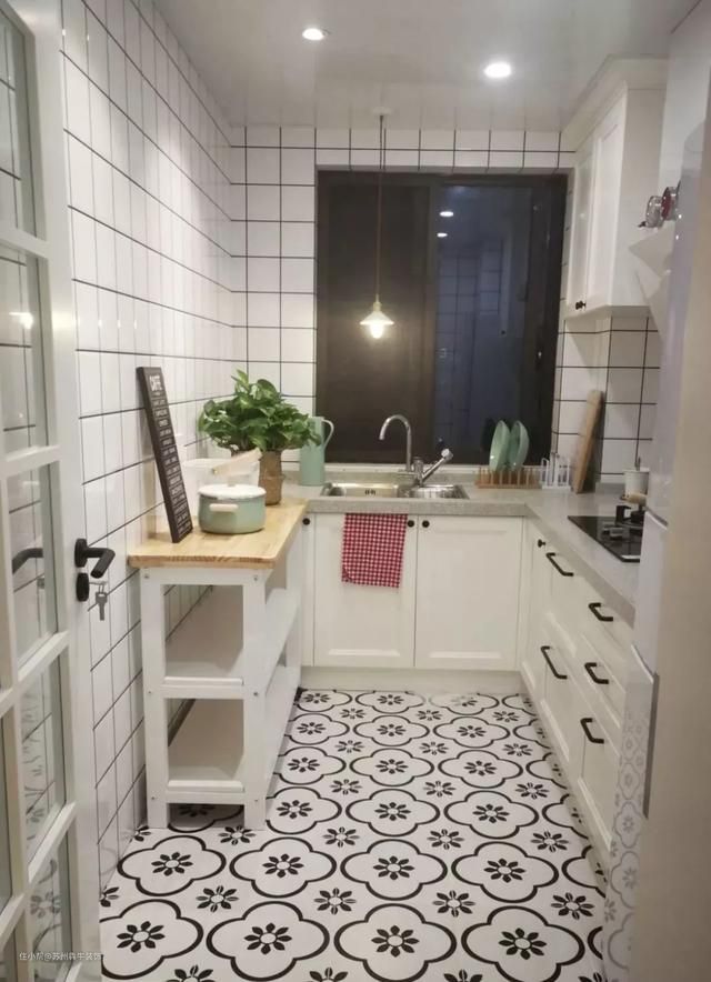 通铺小白砖可能也会导致太过单调一些,所以很多设计师会推荐在厨房的地面铺贴花砖,把花砖和小白砖结合起来,颜值更高。