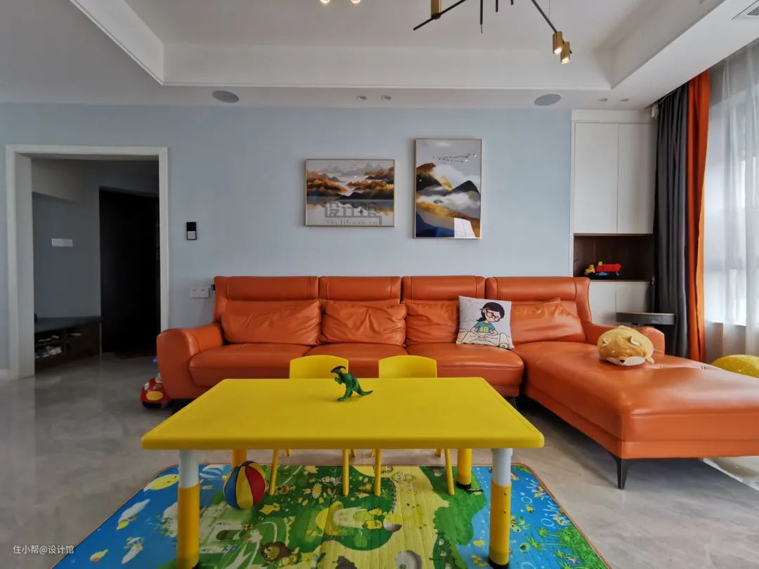 沙发墙的面积比较大,如果不想挂画的话,可以发挥一些想象力,在这面墙上做墙绘或创意墙饰,把沙发墙整体做得更加有趣,让客厅空间显得更加高级而档次。