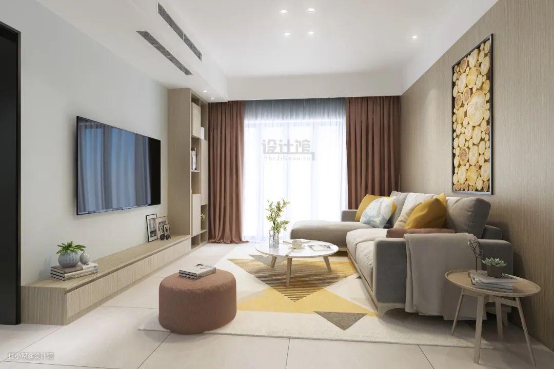 如果沙发墙后方刚好有凸出的柱子的话,那么可以沿着这个柱子砌上矮墙,并在矮墙上做一个置物展示台,这样这个位置可以放装饰画、相框照片、绿植盆栽、手办展示品之类的,让客厅更加丰富有趣。
