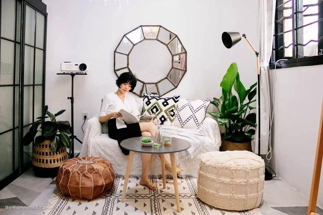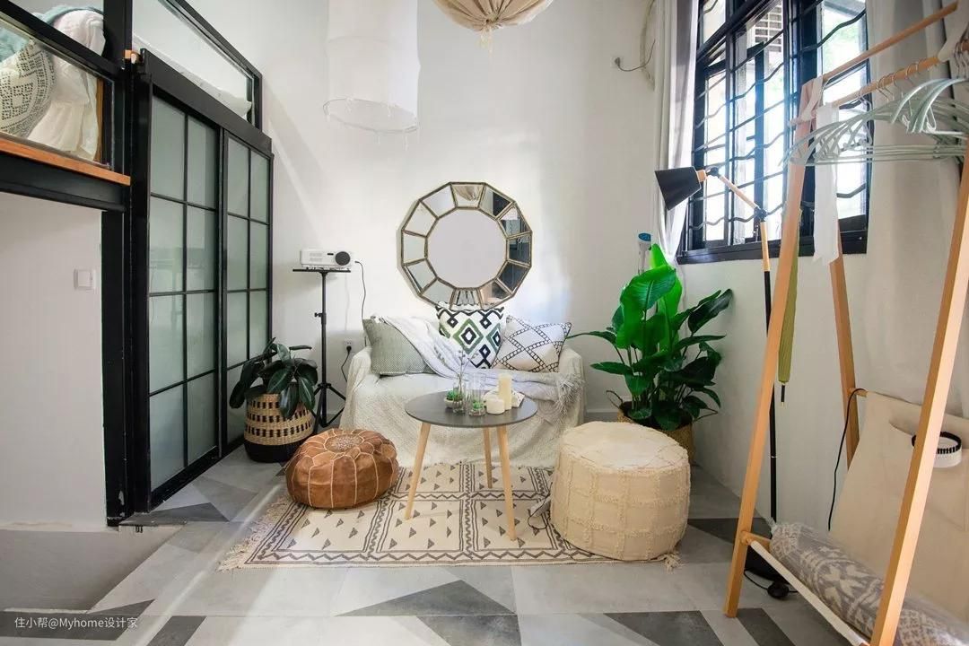 90后的财务白领小姐姐与设计师沟通后,利用高质感家饰改造,融入米白色系的沙发、地毯、吊灯打亮空间,大量几何图腾与阔叶绿植,让人仿若走入摩洛哥的异国领域。