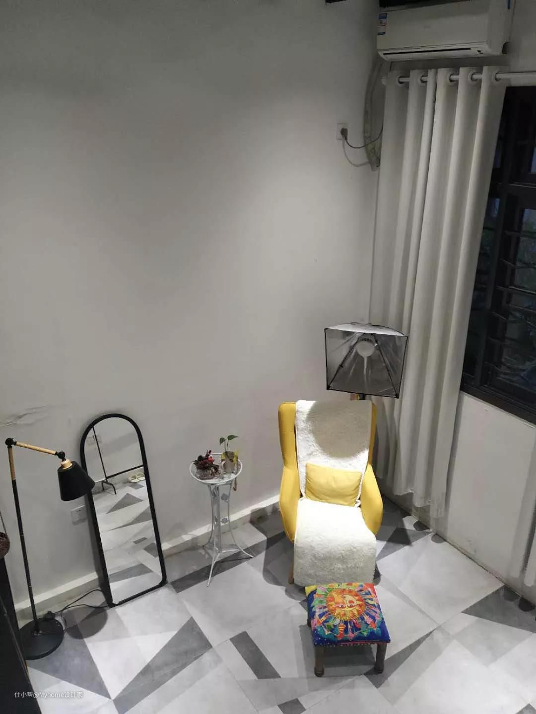 这是原先客厅的布局,选用单人沙发、脚踏,搭配摄影灯,而全身镜旁又多了立灯,未免显得有些累赘。