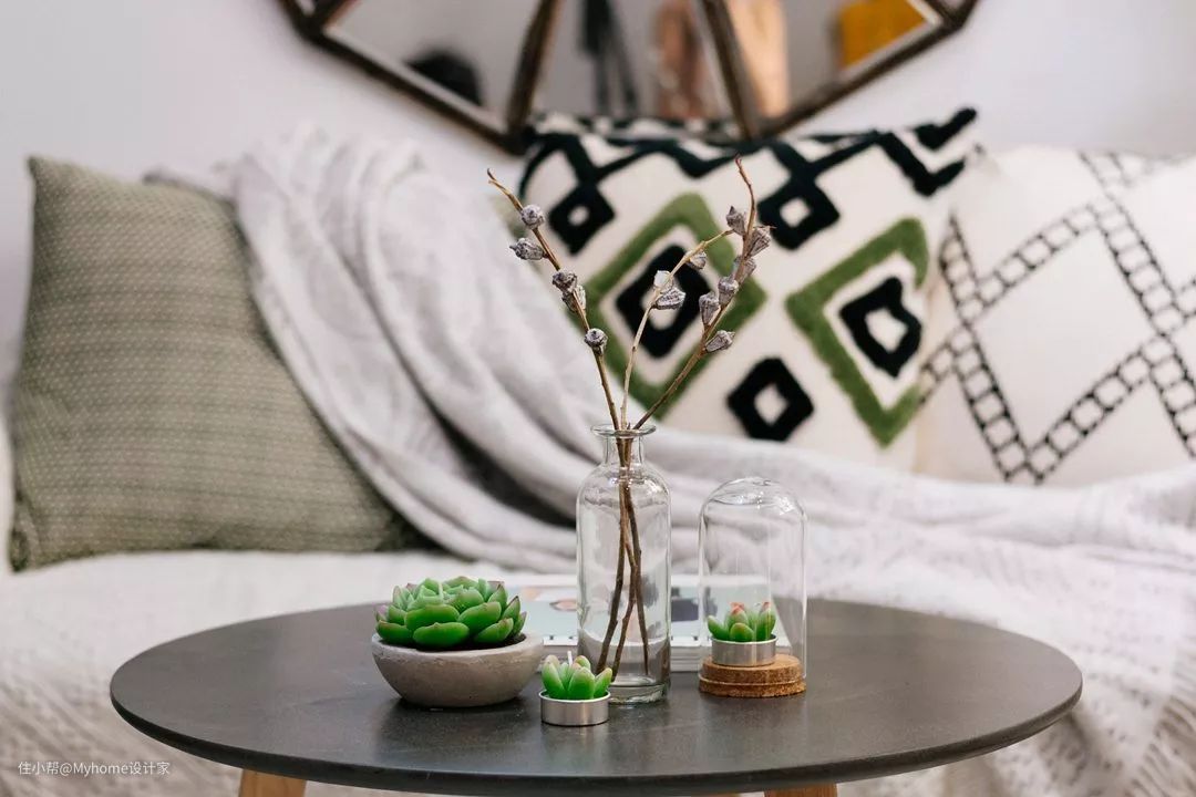 为了不让净白的空间过于清冷,沙发两旁点缀绿植,桌面布置仙人掌蜡烛,清新草绿为空间注入丰沛活力。