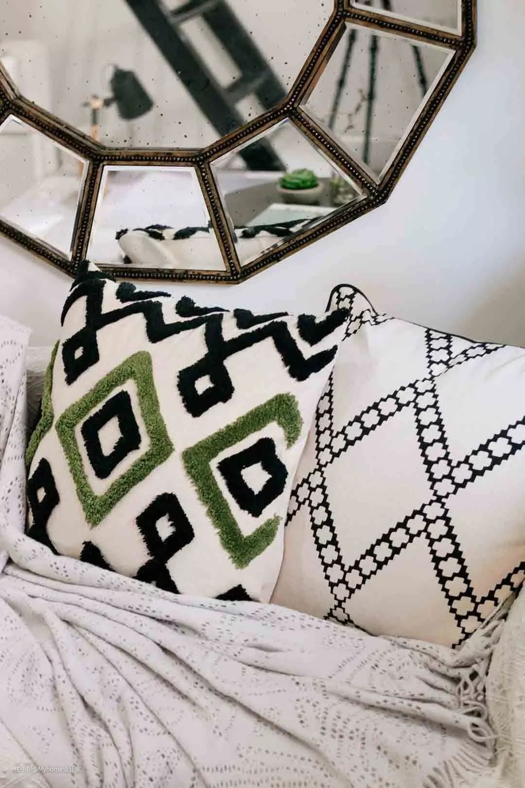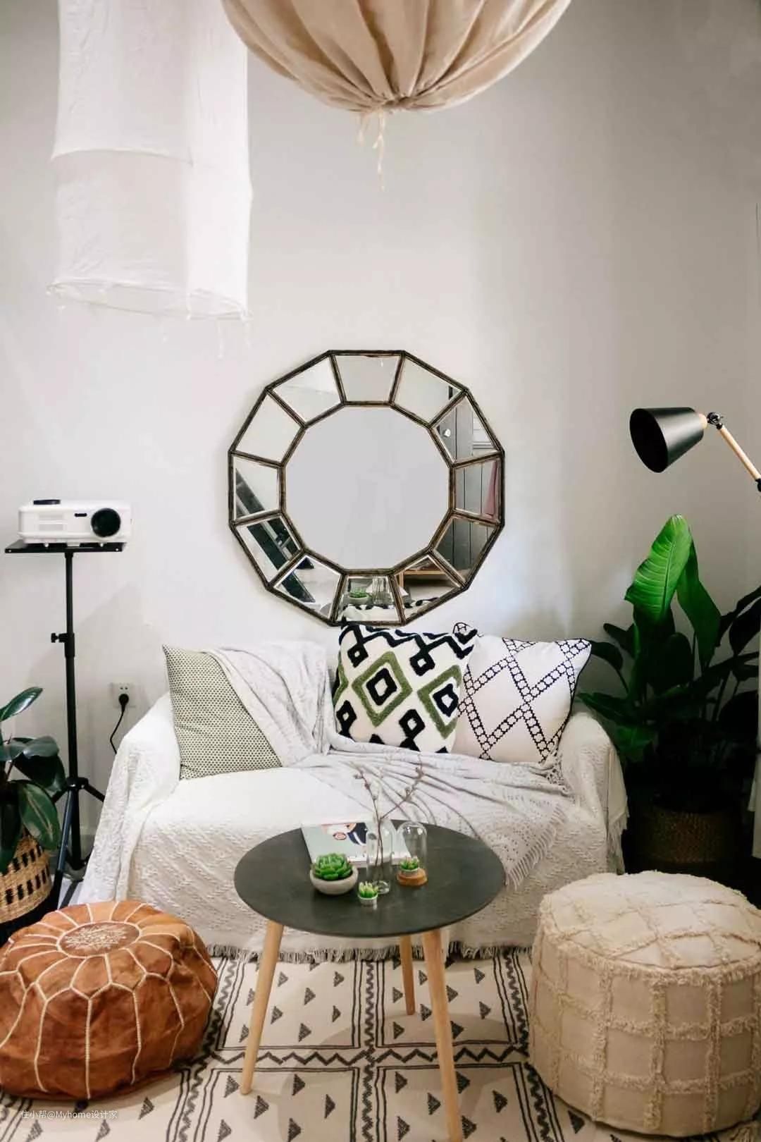 墙面安排大型几何镜面,瞬间成为空间焦点,白色靠枕、地毯搭配几何图腾,正好与镜面相互呼应,融入大量摩洛哥元素,打造仿若置身国外的度假氛围。