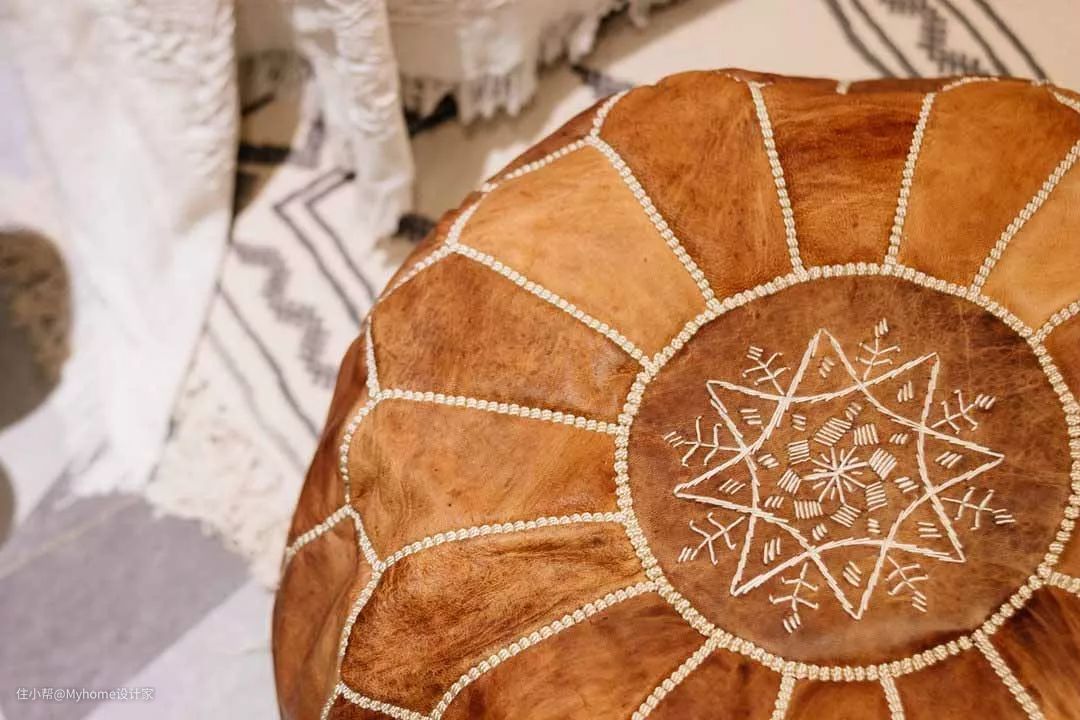 搭配摩洛哥羊皮坐墩,净白空间顿时有了暖度。花瓣般的拼接设计显得大气有质感,细致图腾更增添异域的古老风情。