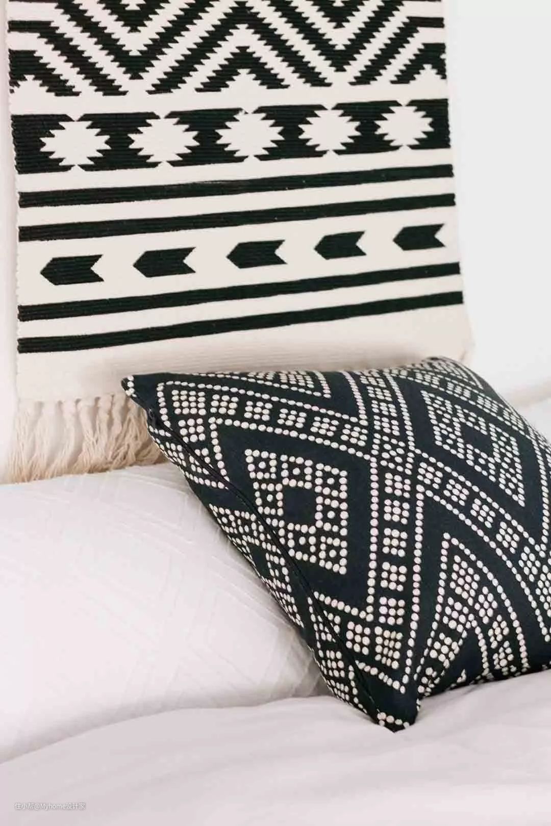由于客厅只有2.7米宽,特地选用两人沙发,视觉比例正好均衡,两侧留有放松的余欲。盖上白色沙发布,H&M的几何图腾抱枕反而衬得更突出。