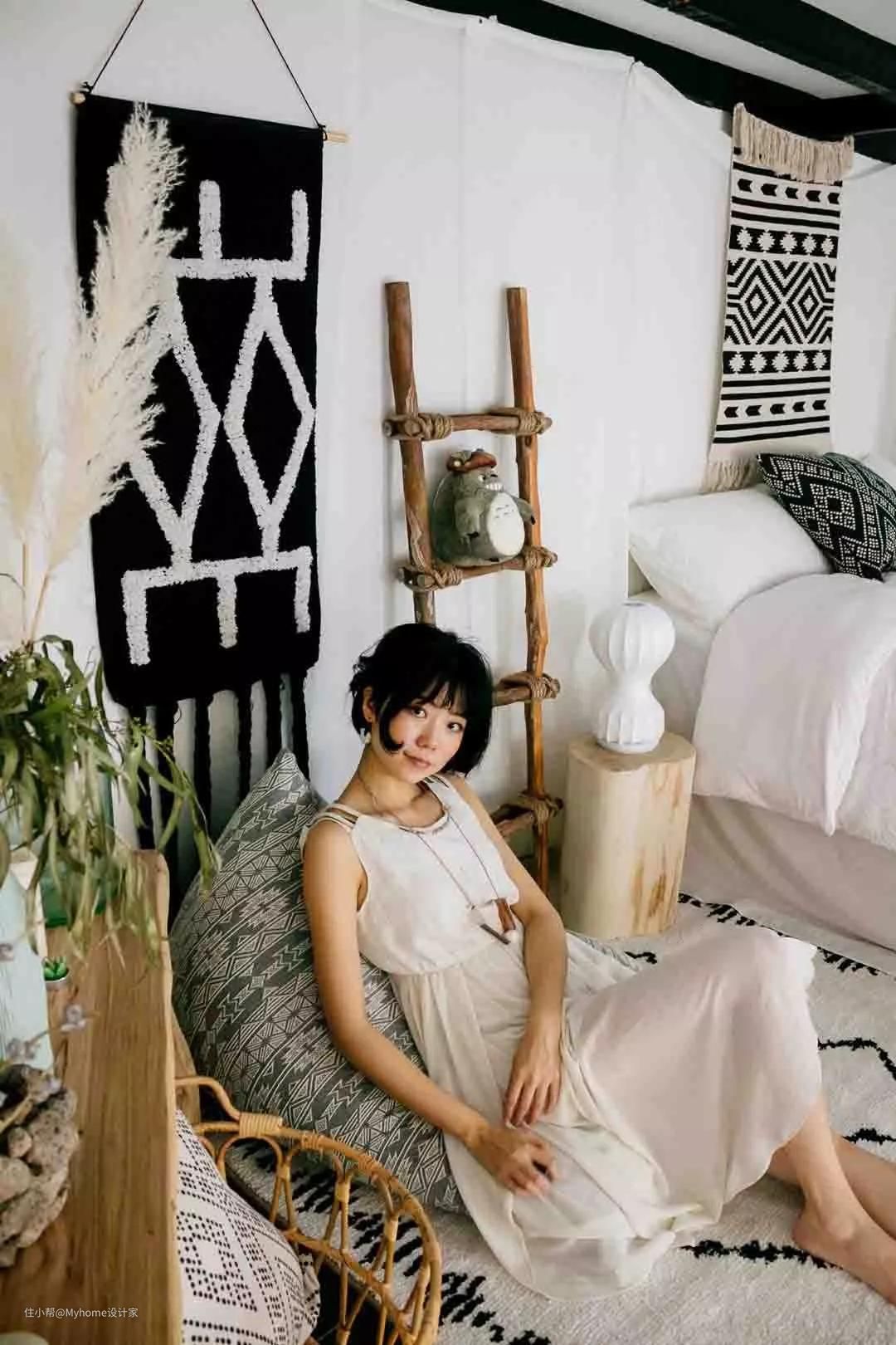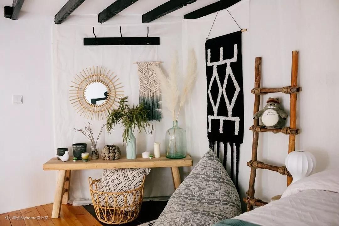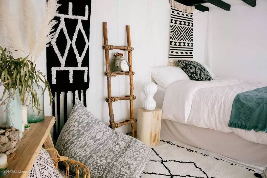 墙面则点缀挂毯、木梯,大白墙也不单调。