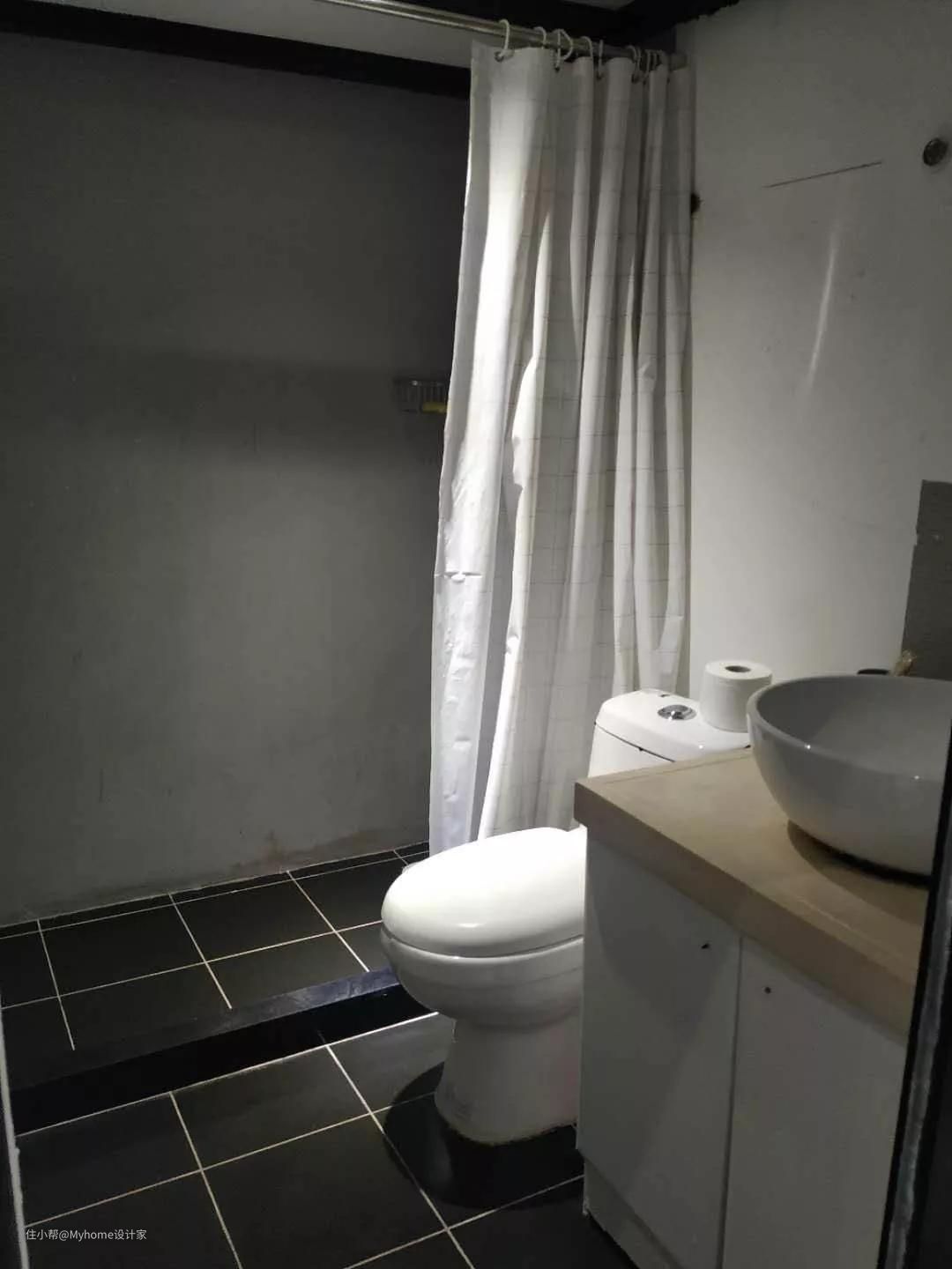 水泥墙色的卫生间显得过于单调无趣,再加上墙面有些发霉,需要加强防潮。