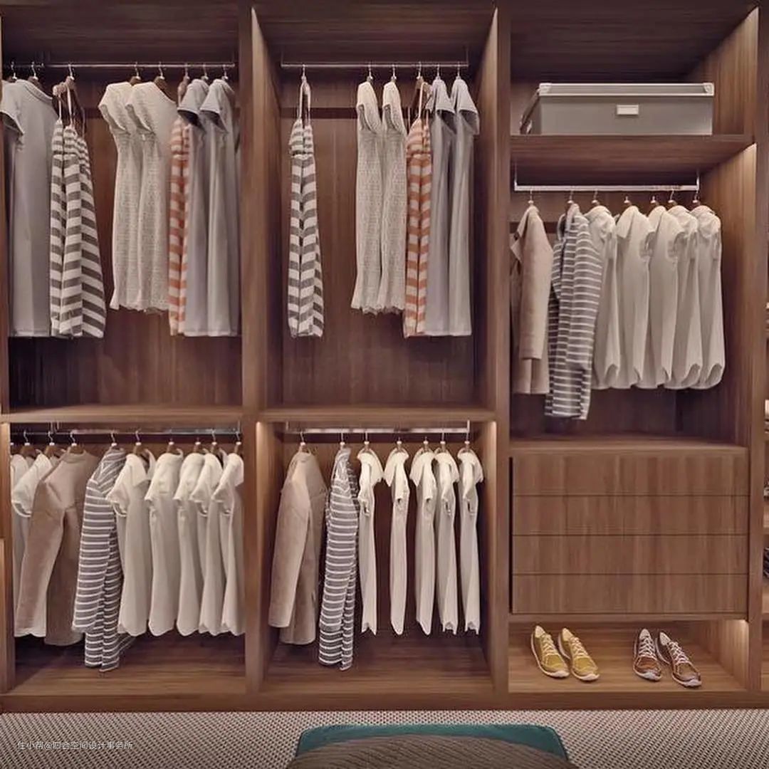 女士的衣物,可根据衣物的情况,长衣多还是短衣多,叠放衣物多不多来做设计。一般情况,女士储物柜衣通是比较多的,隔板相对少一点。