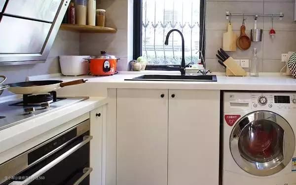 洗衣机放在台面下算是最常见的方式。因为洗衣机的高度和深度都能完美契合橱柜的尺寸,白色的洗衣机丝毫没有拉低厨房的颜值,反而和白色的墙面、台盆有了呼应,有一丢丢点睛之笔的意思。