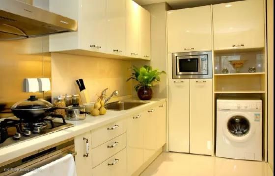 一个常见的橱柜深度为600mm,而橱柜的高度一般来说在800-900mm之间。就这个尺寸而言,厨房台面下塞进洗衣机完全没有问题。哪怕是给洗衣机和柜体之间留有缝隙,浮动个几厘米也完全可以接受。根本不会存在为了塞下洗衣机,就使整个厨房台面尺寸不合理,垮掉的情况。
