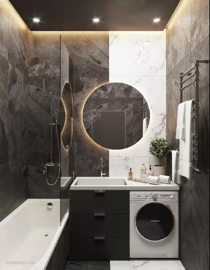 洗衣机放卫生间最大的好处就是,洗澡换下来的衣服直接就能在卫生间洗,超级方便,简直是懒星人的福音!但至少要保证卫生间有5㎡,洗衣机最好放在干区,远离淋浴区的位置,防止水汽影响洗衣机的寿命。