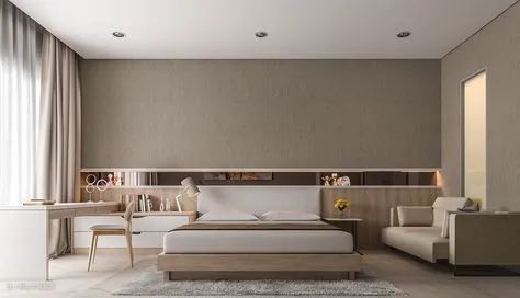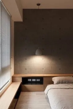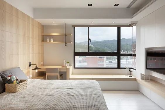 飘窗延伸至床头的位置,转角处加以设计,形成一体式床头柜,这样的设计空间整体性极强。