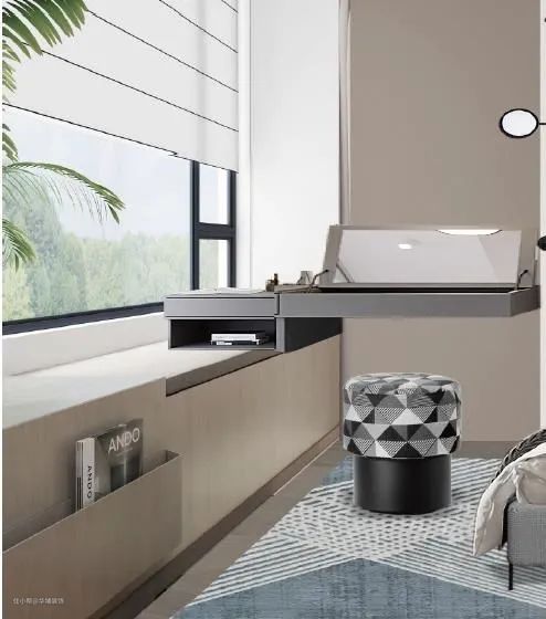 飘窗或者卡座加一个转角,延伸出来,设计一个桌板,刚好形成一个小型梳妆台,如果梳妆台台面空间尺寸不够,可以借助飘窗柜上方的位置,增加桌面的空间。