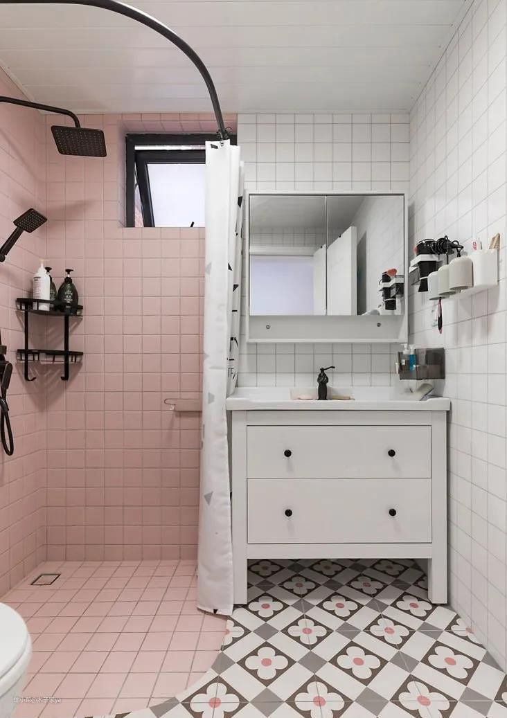 卫生间地面铺贴花砖虽然搞卫生有点麻烦,但是挡不住它好看啊。特别是喜欢北欧、简约等风格的人,地面铺设花砖,充满小清新和复古的味道。