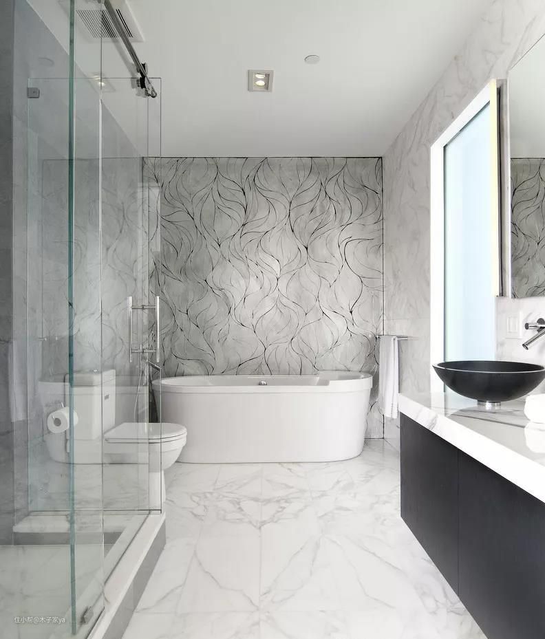 卫生间墙面和地面可以使用大理石,高档又上档次。像一些前卫的设计师,会在卫生间地面选用大理石,采用特殊材料对大理石进行处理,表面产生凹凸颗粒感,整体高档又好看。
