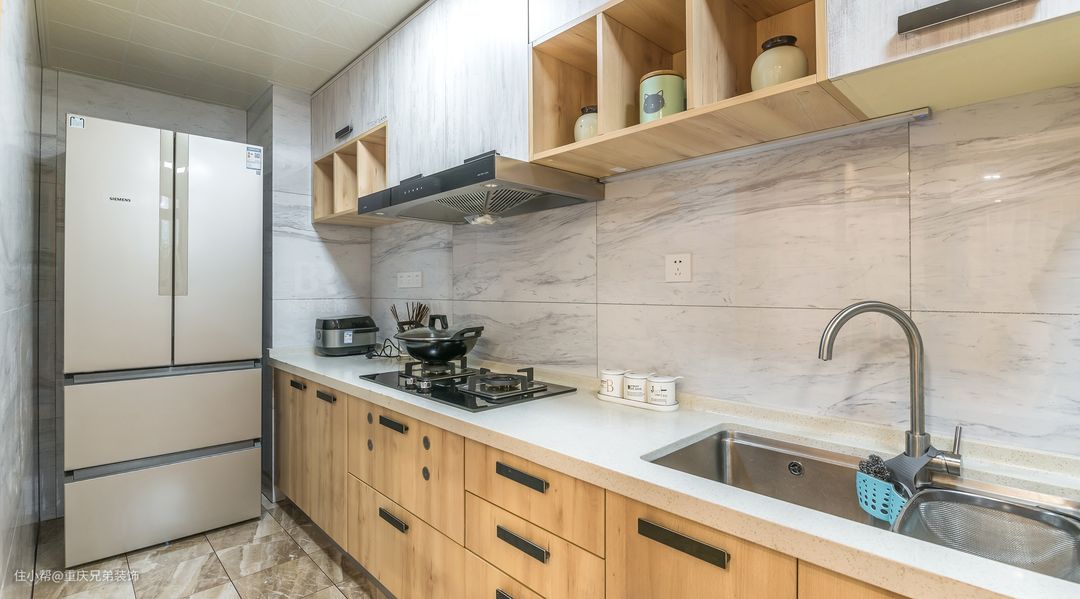 一字型的厨房是最省钱的,少了背板和遮丑的材料,对工艺要求也比较低,白色墙面+木色地柜+白色柜门的吊柜是北欧风中常见的搭配,明亮,自然、舒适。