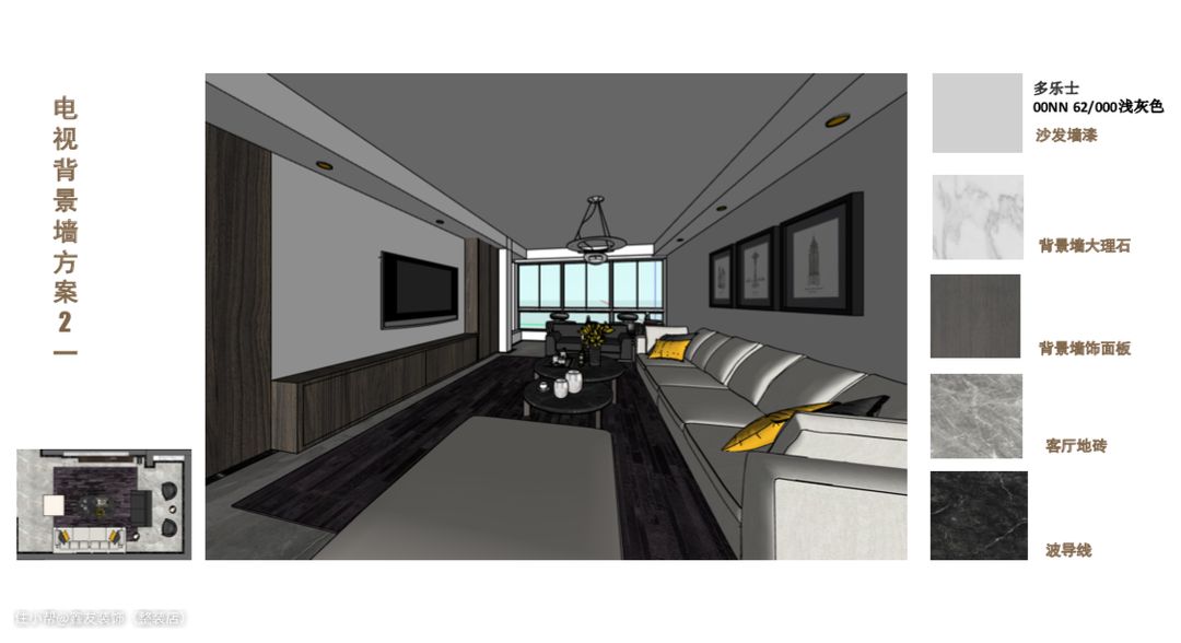 设计师把空间立起来之后,作为业外人士来说,还是能大致体会出整个空间是拥挤或者宽敞。包括沙发的样式,客厅的导台,吊顶的美观度,灯饰的选择等能给一个大致的购买参考。然后,设计师在草图里头大致表上了硬装部分(墙漆,地砖,饰面板)材质,能看出这个空间硬装结束后的大致模样。