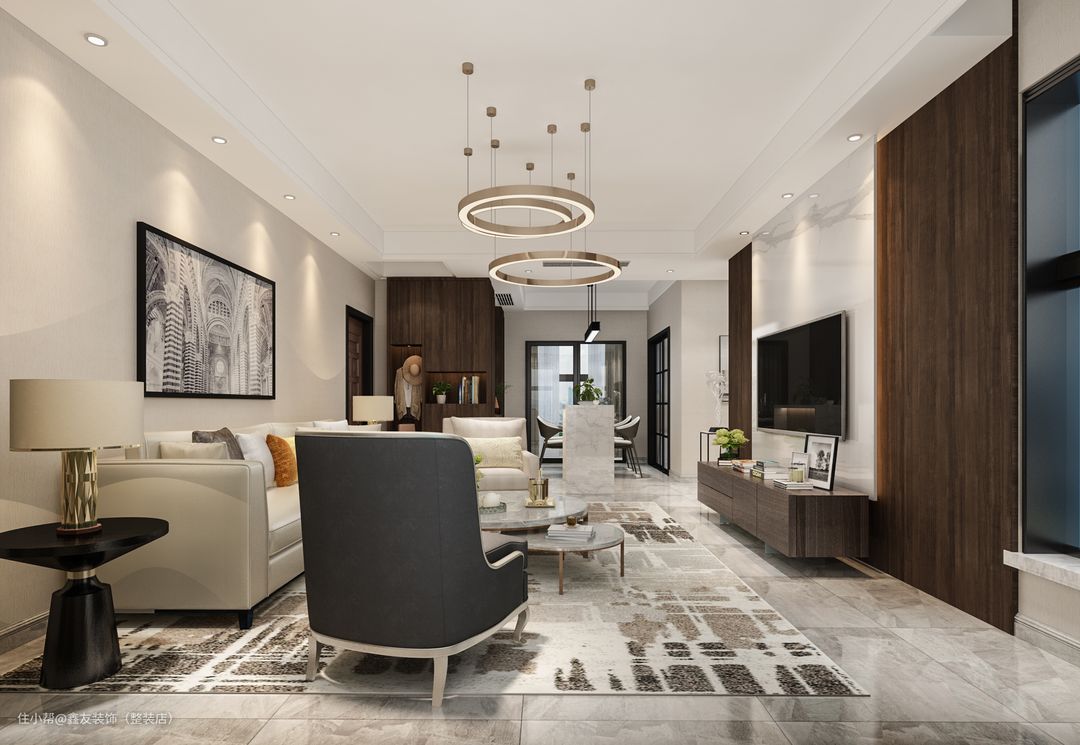最后根据全家人喜好的色彩搭配风格,家具的选样及软装配饰的选样,进行硬装材质的搭配。这一块取决于设计师对于全案设计的审美把控。我们翻到文章开头,业主提供了一张效果参考图。这是业主在买房子之后就一直在网上,朋友介绍各种渠道翻找了不下于1000套图终于确定了的自己喜欢的色彩灯光搭配。设计师需要把整个效果图的元素提炼出来,并应用在整个空间上。