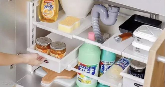 清洁用品类,液体清洁剂适合放到水槽下方空间,利用伸缩杆、收纳盒能放下不少清洁用品。