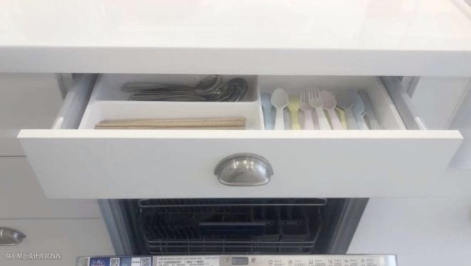 洗碗机上下的空间也不要浪费,定制尺寸刚好的抽屉,非常实用。(所以,要先确定洗碗机的尺寸,再定制橱柜)