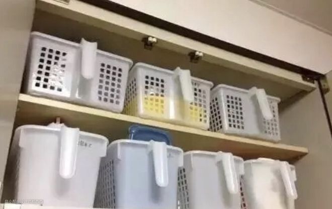 如果吊柜都装拉篮预算超支的话,也可以考虑带把手的收纳盒,自己做好分类标识。虽然不如拉篮这么好查找,但也算是退而求其次的选择了。