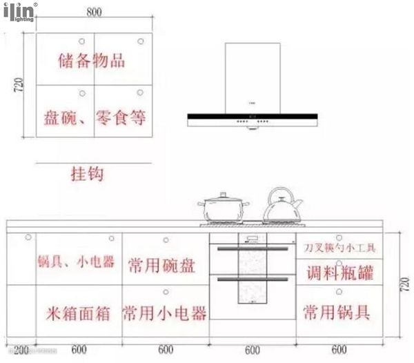对于其他锅具和电器,重量小、不怎么用的放进吊柜,重量大、使用较为频繁的放进地柜中。
