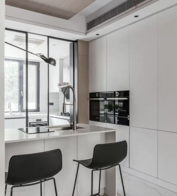 除了餐边柜,现在很流行在厨房外面餐厅的位置再设计一个西厨,也能让厨房的收纳翻倍。