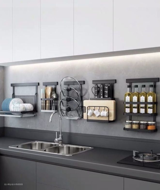 铲字漏勺以及刀具使用频率高,借助工具放到台面上、挂在墙面或者收纳到地柜中都可以,根据自己的使用习惯来。