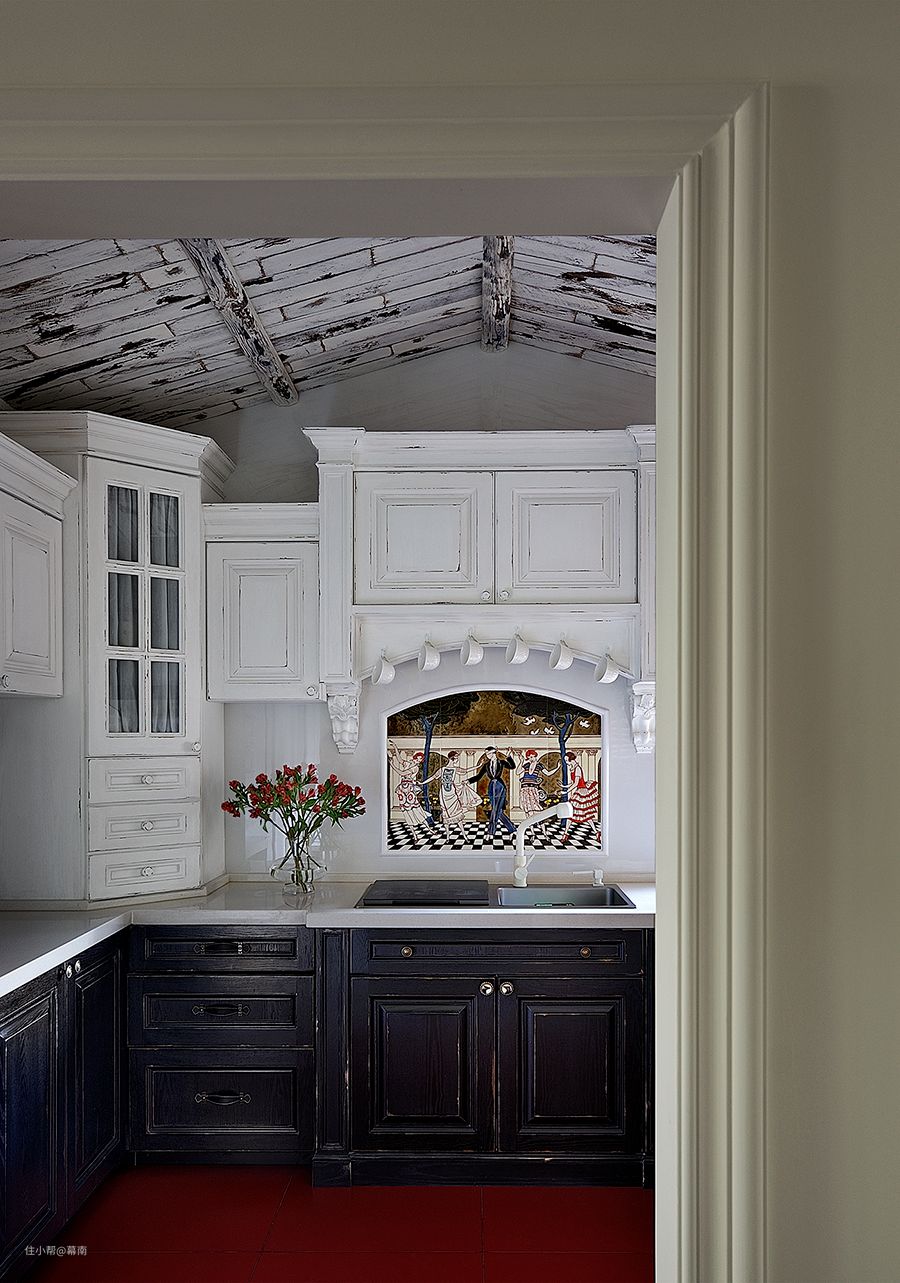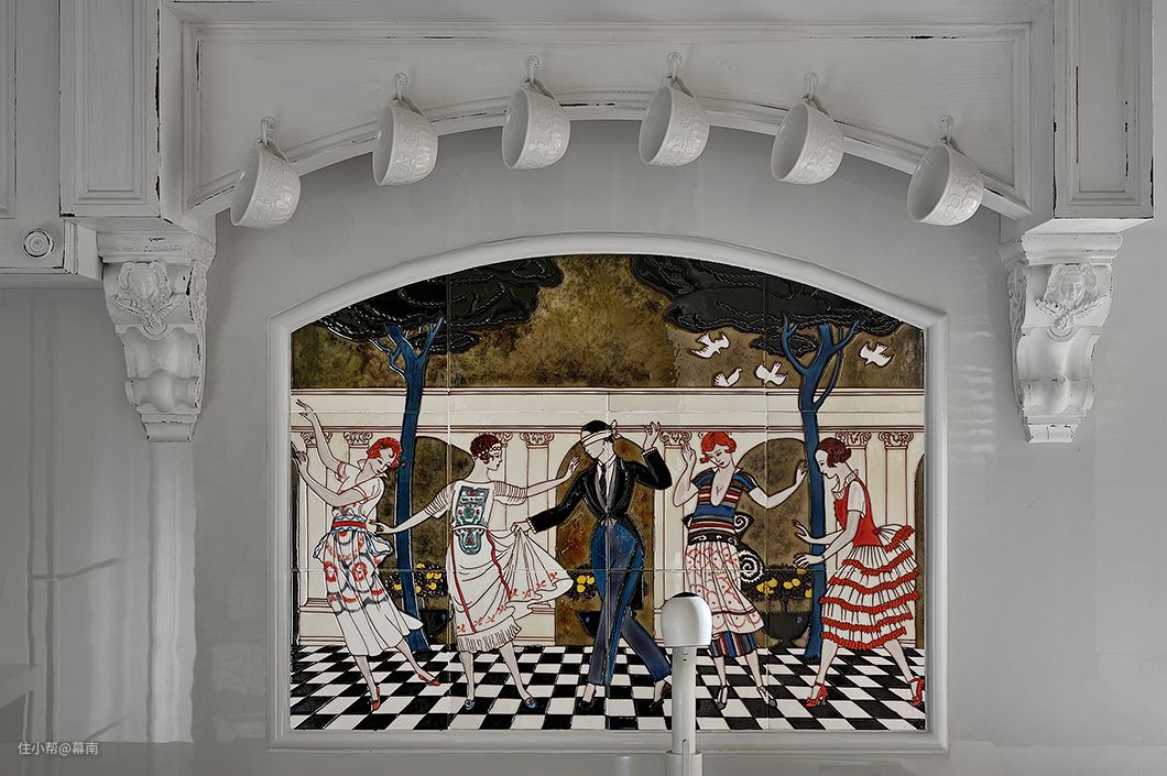 水槽上空的瓷砖是定做的,全球独一片。橱柜是木工现场打制的,配合花砖的活泼俏丽。业主很开心:“这是艺术品啊,贴在油烟味重的厨房实在有点亵渎,将来要是仙去,要把它从墙上抠下来带进坟墓!”