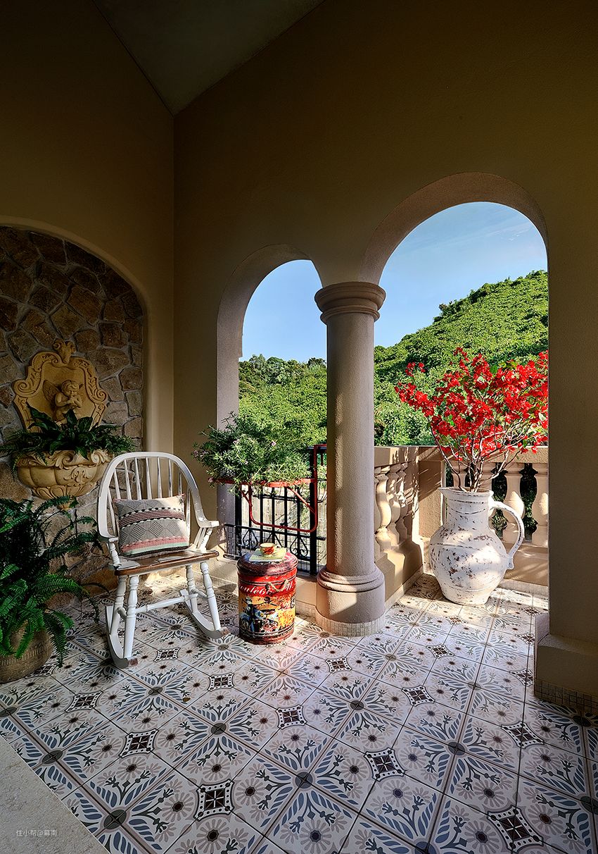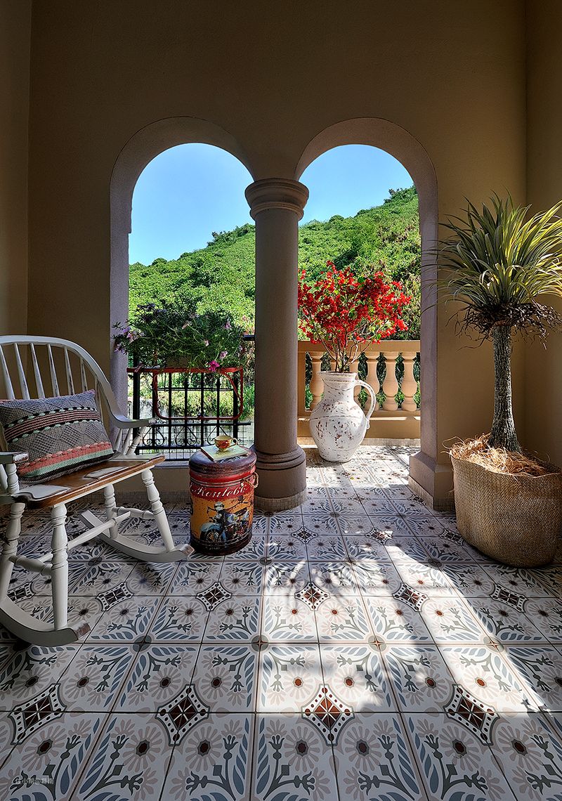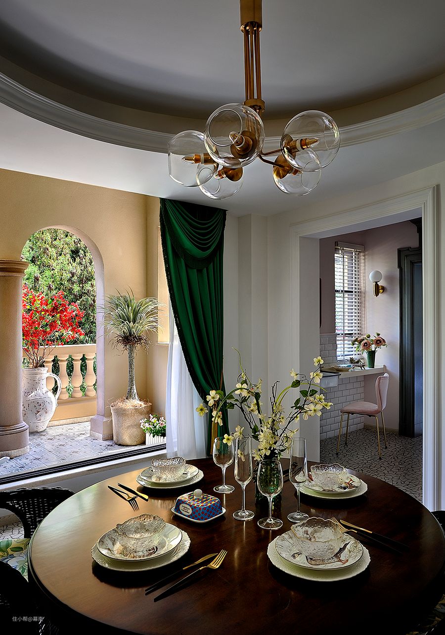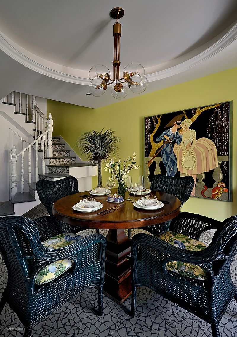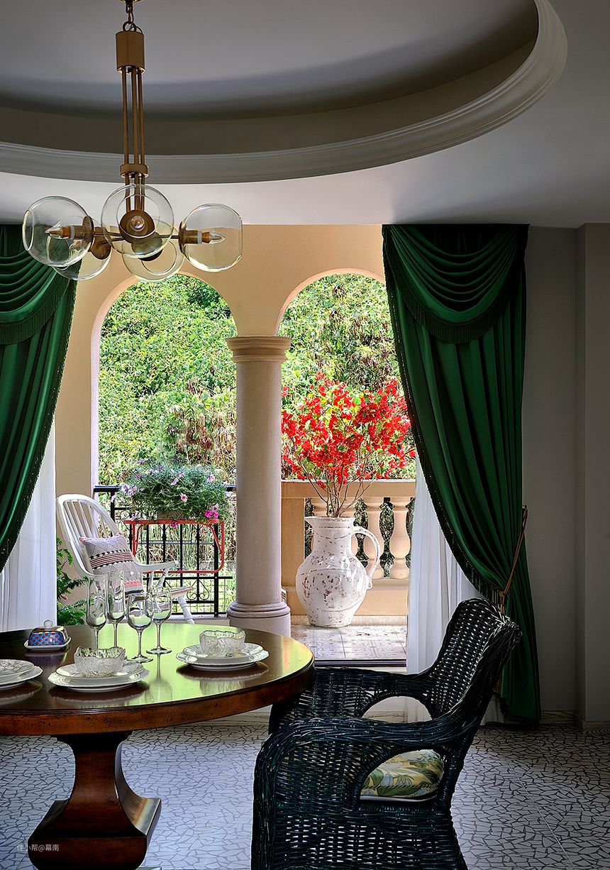 经探讨取消客厅,电视移到楼上视听室,餐厅兼休闲会客功能,让空间宽敞些。墨绿藤椅配上碎花垫子呼应着窗外满山的绿,画中的花瓶柱象极了露台栏杆,虚实交替的手法类似写意画的以少代多,想象弥补留白。