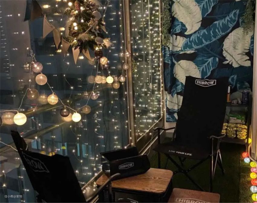 又或者将阳台打造成露营风的休闲区,搭配上小帐篷、小伞、和露营椅,还能在四周挂上小灯串,夜晚时分,灯光微弱,阳台上的小角落也变得生机又浪漫,足不出户感受露营的美好。