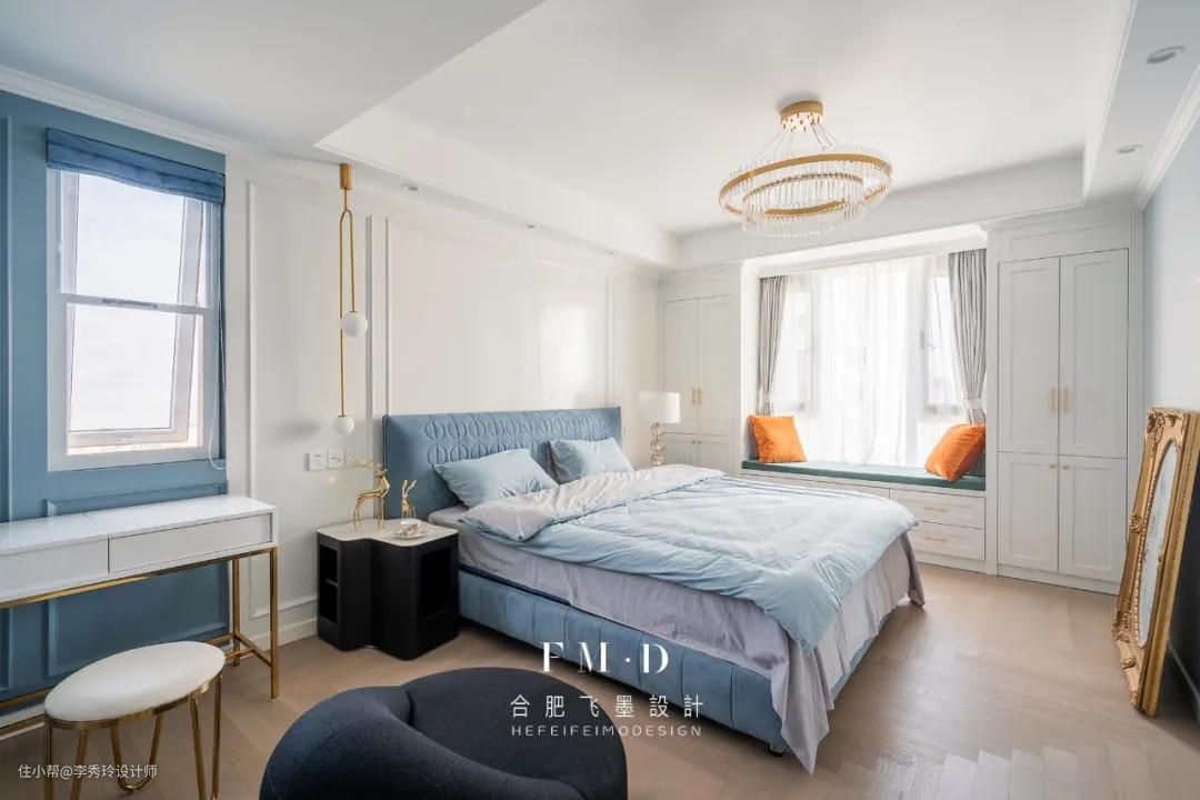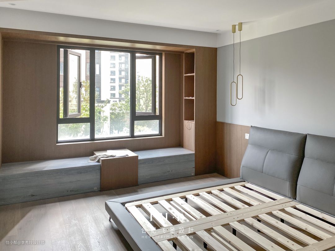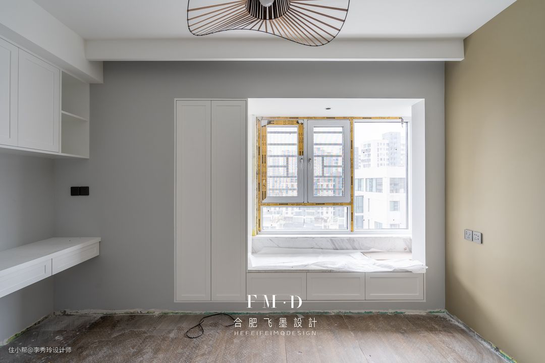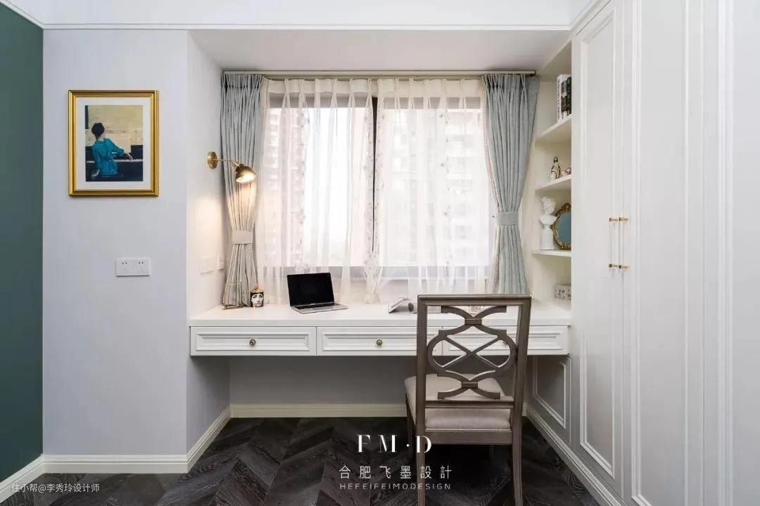 飘窗作为房间里采光较好的地方,打掉现场手工制作书桌,空间贴合度最高;高度通常设计在75cm上下,可根据业主身高进行上下调节。