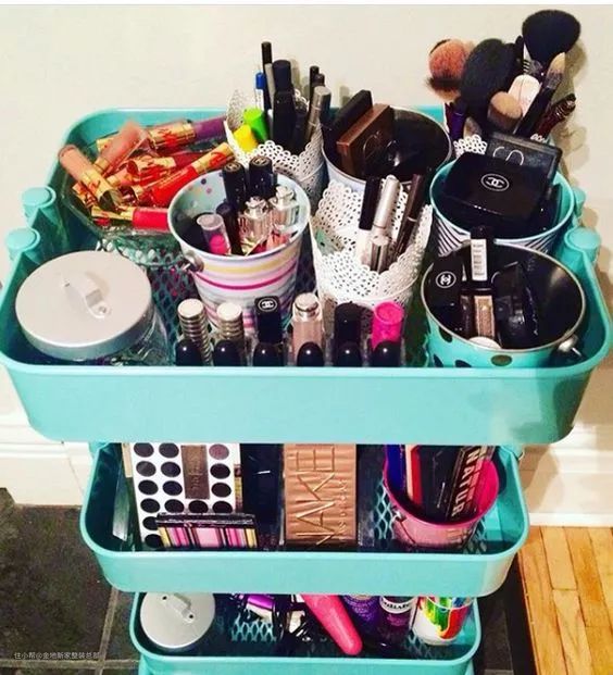 如果没有梳妆台,被各大美妆博主推到烂的拉斯克小推车你必须入手,哪里化妆推哪里,每层按化妆分类收纳,与抽屉相比,它的收纳空间妥妥够用。