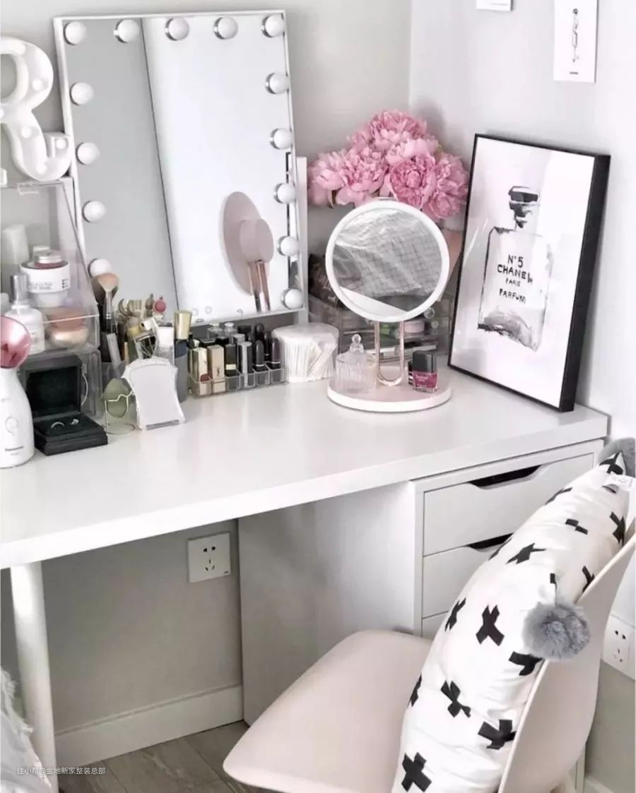 把常用护肤品放进带有玻璃罩的收纳盒,整齐又防尘,而彩妆用亚克力收纳格,分隔有序,与貌美的口红和眼影配一脸,放化妆镜让妆容更精致,一幅chanel趣味画和粉色康乃馨成为整个梳妆台的点睛之笔,幸福感大大提升!