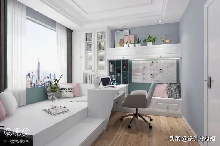 ▲仍旧是榻榻米结合L型书桌柜组合,书桌书柜组合设计更加整体,储物力也超棒!造型门板搭配珠光白木,巧用清新绿和公主粉点缀,欧式风立显,无论是小孩还是大人都超喜欢。