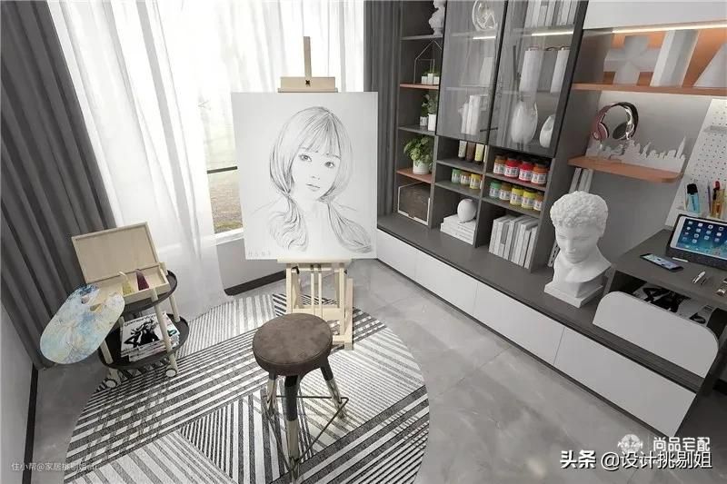 ▲靠墙设计陈列展示柜+书桌,留出大部分的空间作为绘画区和学习创作区。右边是学习区,柜体是白色搭配山隐灰,开放式书架用爱马仕橙做跳色点缀,用灯带做装饰效果,更显高级轻奢感。