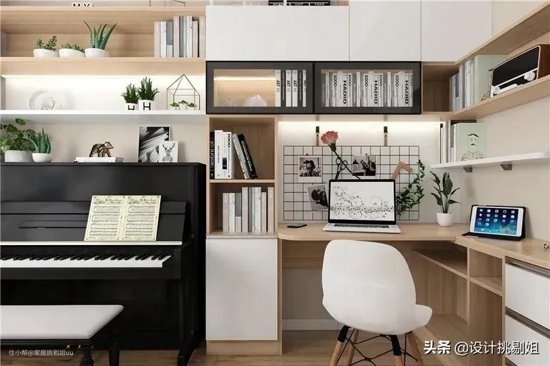 ▲转角书桌是小书房的绝佳配置,小面积也能实现更高的空间利用率,更加宽敞实用。靠窗放置钢琴,光线均匀方便看琴谱。钢琴上方设计开放层板,可以放置琴谱等书籍。