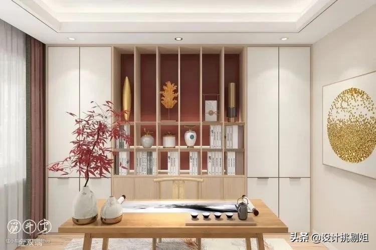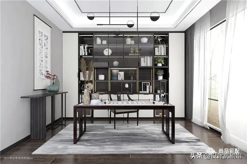 ▲新中式轻奢风书房,整墙储物展示柜,中间放一张中式书桌作为书写区,整个空间没有太多多余的设计,保留最传统的书房功能,用来看看书、练练字画。