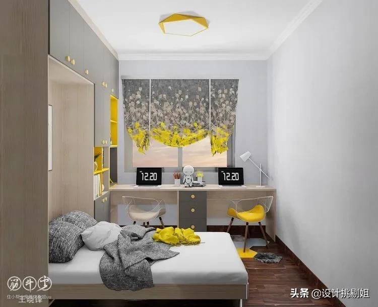 ▲靠墙做上翻床,双人工作区可以满足两人同时办公学习,并留出足够的活动空间。用原木+灰作为主色调,再用芒果黄点缀,空间灵动可爱。