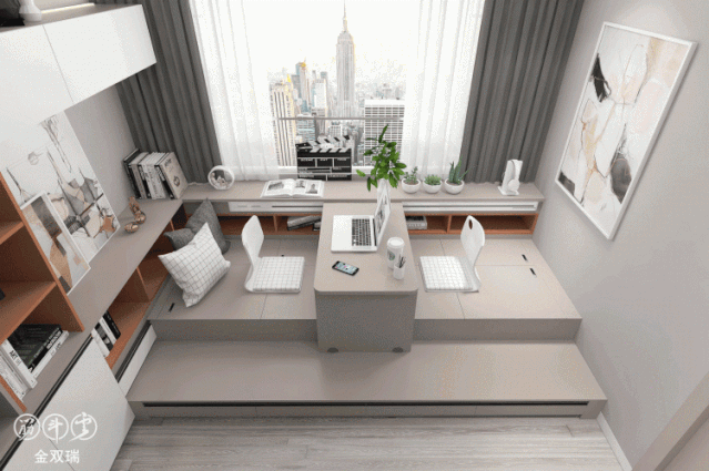 ▲榻榻米的储物力不用多说,再搭配滑动桌,可滑动至榻榻米中间供双人使用,双人工作、学习都很nice,榻榻米还可当飘窗柜休闲使用,是下午茶的好去处。