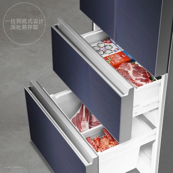 多开门:是双开门和抽屉的混合形式,一般来说上方是冷藏室,形式为对开门,下半部分是冷冻室,是两到三个抽屉。冷藏室和对开门形式类似,而冷冻室的抽屉对于取放食材,特别是体积比较大的食材更加方便。