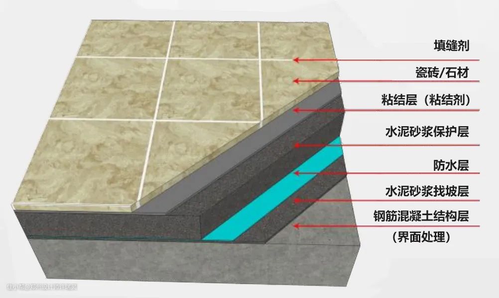 地面铺贴瓷砖或石材,正常的施工流程为:基层处理→刷界面剂→水泥砂浆找坡层→水泥砂浆防水保护层→粘结层→饰面层→收口