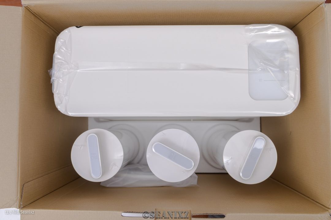 下层是主机和三个滤芯,与其他产品不同,米家在净水器上的包装使用了真空的食品级包装,应该是为了防止运输途中被外界杂质污染,也防止细菌繁殖,第一次见到有对待电器产品有上升到食品级的标准。