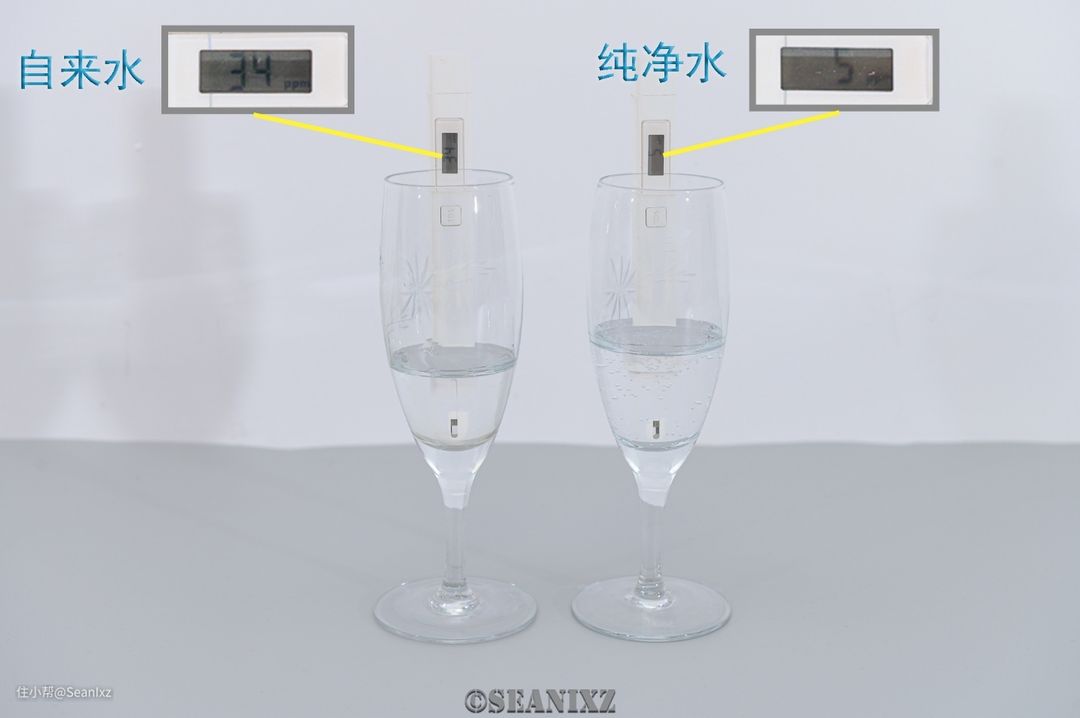 使用水质检测笔测得自来水为34ppm,净化后的纯净水为5ppm,达到了个位数,有显著的效果。不过34ppm的自来水倒也没有很大的健康风险,自来水水质北方一般在100-200ppm之间,主要离子为钙镁离子,饮用容易形成结石,而南方主要有重金属离子,比如湘江流域水体中都含有一定的重金属镉,一些泥沙细菌等大颗粒的杂质一般都以固体形式存在,TDS检测不出来,肉眼也很难看见。所以水质的提升并不是立竿见影的效果,而是长期使用中潜移默化带来的健康。