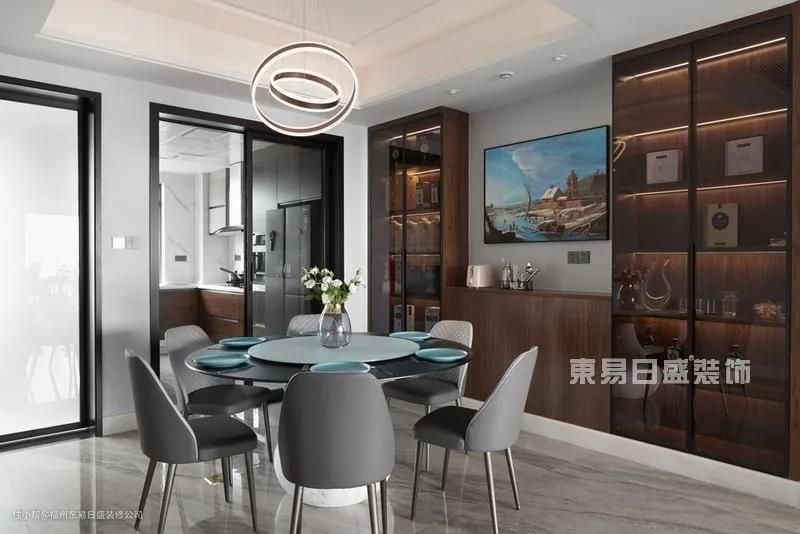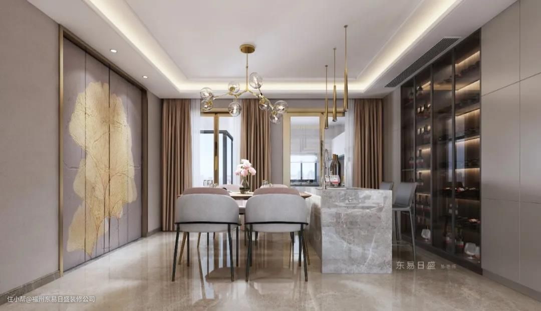 高级灰的圆形餐桌,四周围合质感十足的餐椅,配合有着创意十足的轻奢铜色吊灯,温馨自然。背景墙简单的艺术挂画,两侧木质酒柜的陈设,刻画出平凡生活中的小情调。
