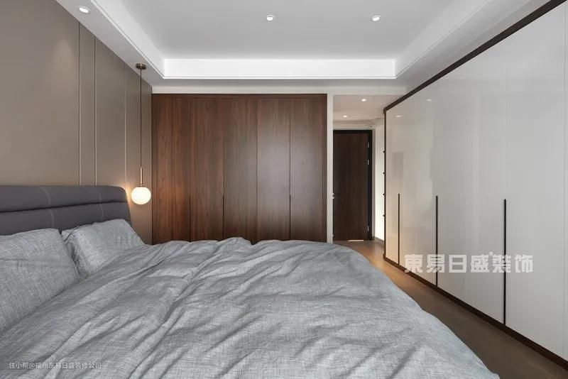 卧室的设计,以打造安静的环境为理念,这里的主角只有沉静的木与纯洁的白。整体配色虽没有浓墨重彩,但却在淡雅中给人安详静谧的氛围。床头造型简单的金属吊灯,为空间增添一分质感。