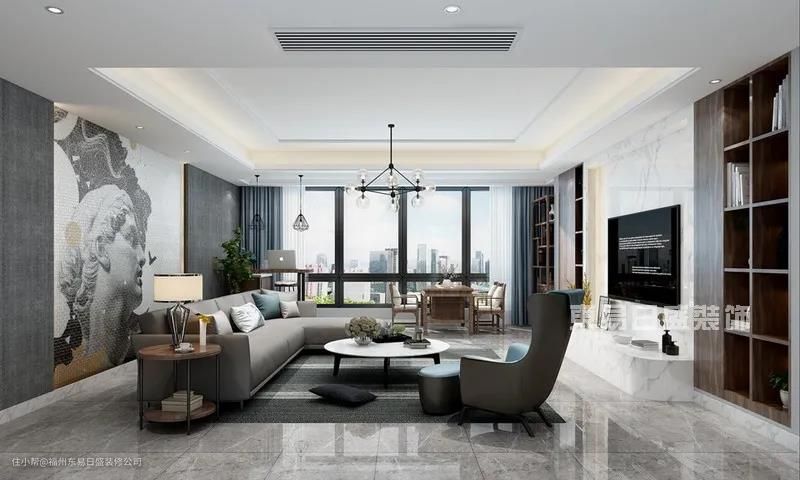 沙发背景墙上大卫图像的表达,在艺术创作中倾注思想也寻找理想,是一种思想向上的理念,也是一种艺术上的至美。简约的灰色布艺沙发后期更改为黑色皮质沙发更显质感,双拼组合茶几和休闲椅,整体的和谐与细节的考究,迸发出设计的魅力。