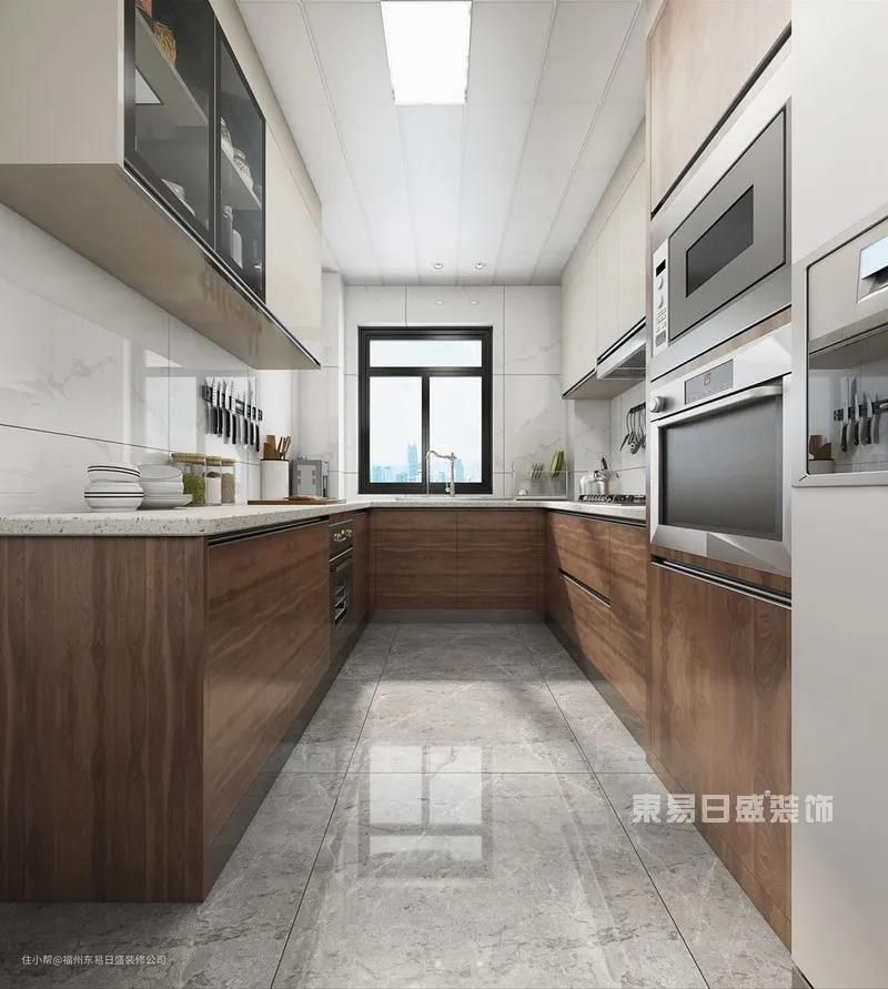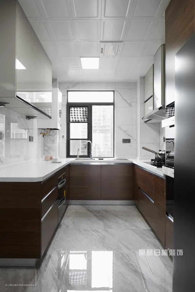 U型厨房设计将洗涤区、烹饪区、操作台及冷藏区划分明确,功能配置充足,动线无缝衔接,既满足了使用空间的需求,又减少了物品拿取往复的时间。