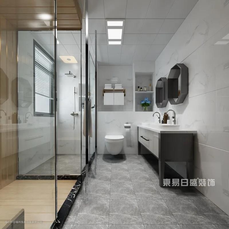 灰白相间的大理石铺就的卫生间简洁大气,灰白色梳妆台柜结合六边镜将现代都市的摩登气质延续于此。